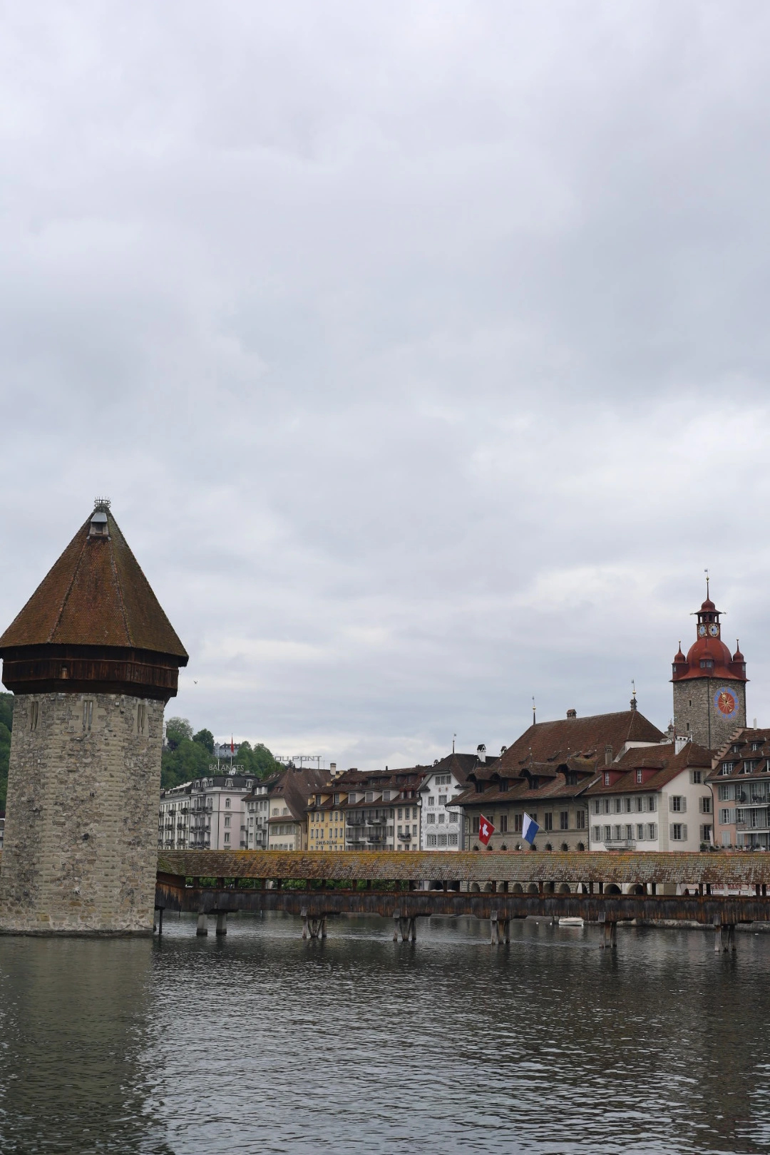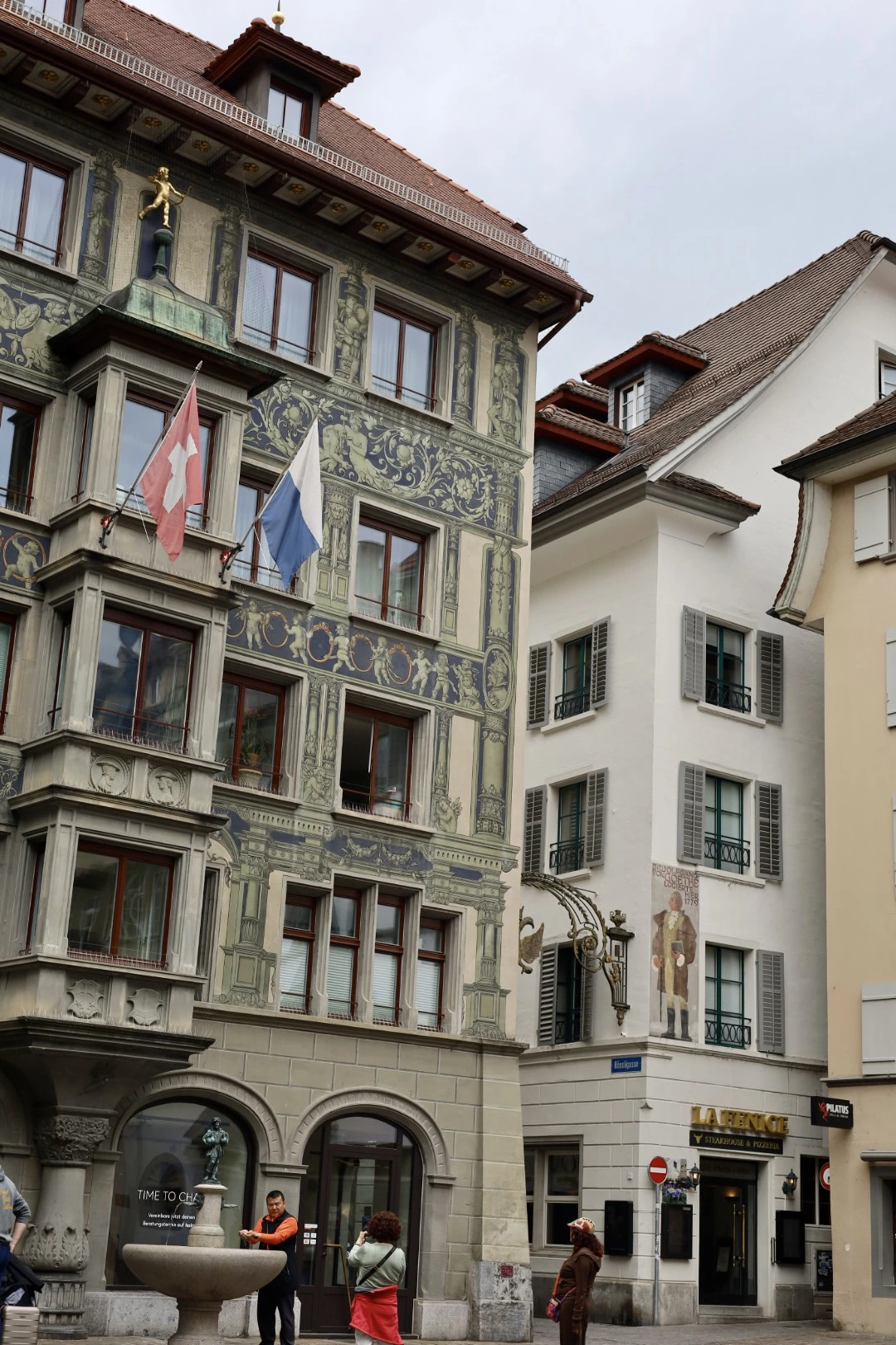 In Luzern hadden we wat tijd voordat de volgende trein vertrok, dus maakten we van de gelegenheid gebruik om even de stad in te gaan. Op het station kun je makkelijk je koffers in een kluis opbergen, en je loopt zo het gezellige centrum in. Dit is echt de moeite waard. Luzern is een sfeervolle stad waar je heerlijk kunt struinen door kleine straatjes vol charme. De gebouwen zijn prachtig! Veel ervan zijn versierd met kleurrijke muurschilderingen of hebben sierlijke, oude gevels die je het gevoel geven dat je in een openluchtmuseum loopt.