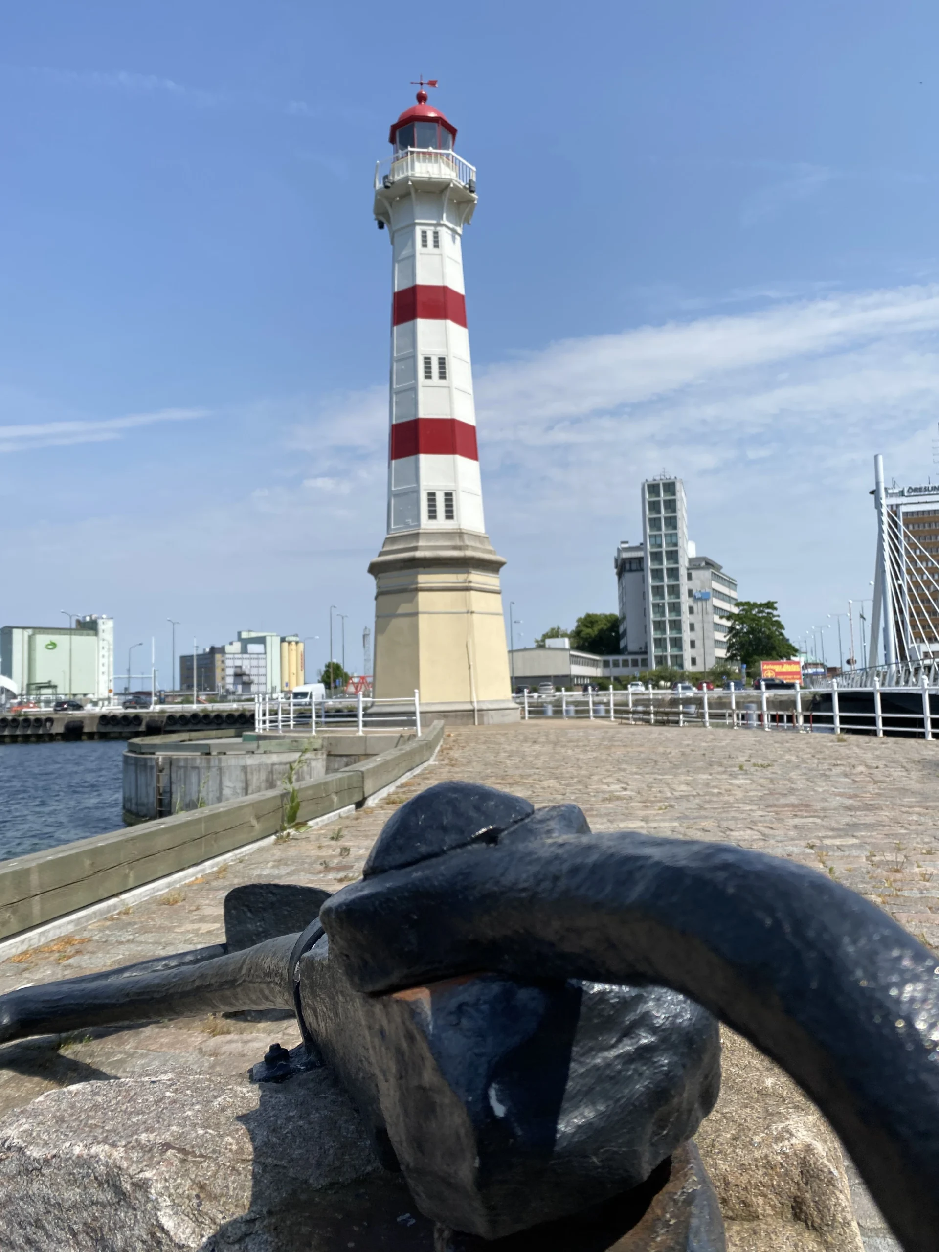 We liepen verder naar de kust, via Salongsgatan, een rustige straat met zicht op het water. Daarna kwamen we bij de oude vuurtorens en et strand van Malmö. Hier ligt ook het Ribersborgs Kallbadhus, een traditioneel Scandinavisch badhuis waar mensen het hele jaar door in zee zwemmen. Vanaf hier heb je ook een mooi uitzicht op de Öresundbrug, die Denemarken en Zweden met elkaar verbindt. Een bijzondere plek om de dag af te sluiten.